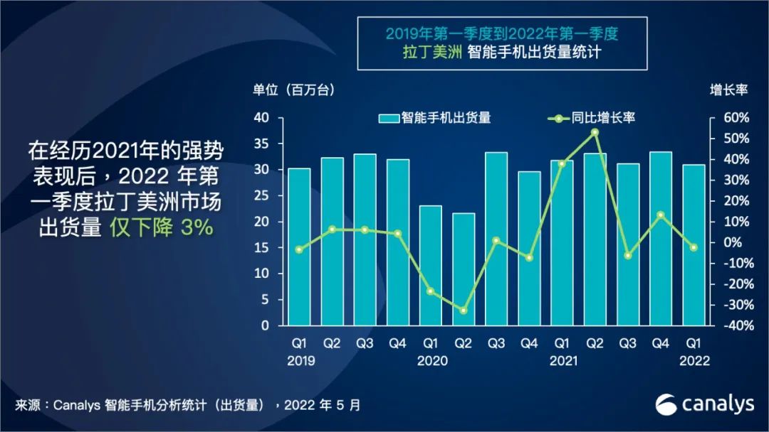 Canalys:得益于三星的优异表现,2022 Q1 拉丁美洲智能手机出货量仅下降 3%